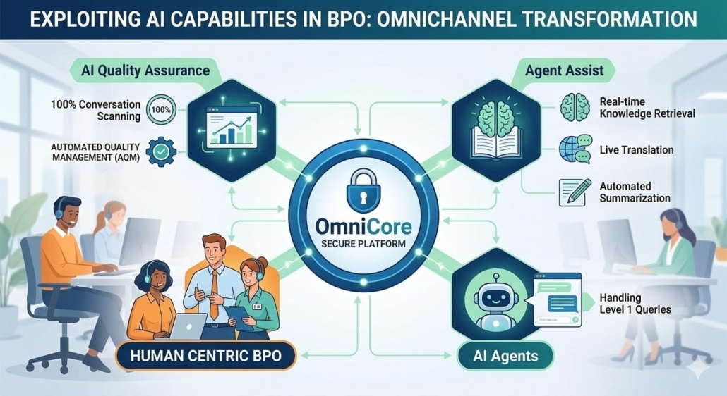 Unlike “bot-only” providers, we use a Human-Centric BPO model. Our OmniCore platform handles Level 1 queries via AI Agents, while routing complex, high-emotion cases to our skilled specialists. This ensures 100% speed for simple tasks and 100% human touch for critical customer moments
